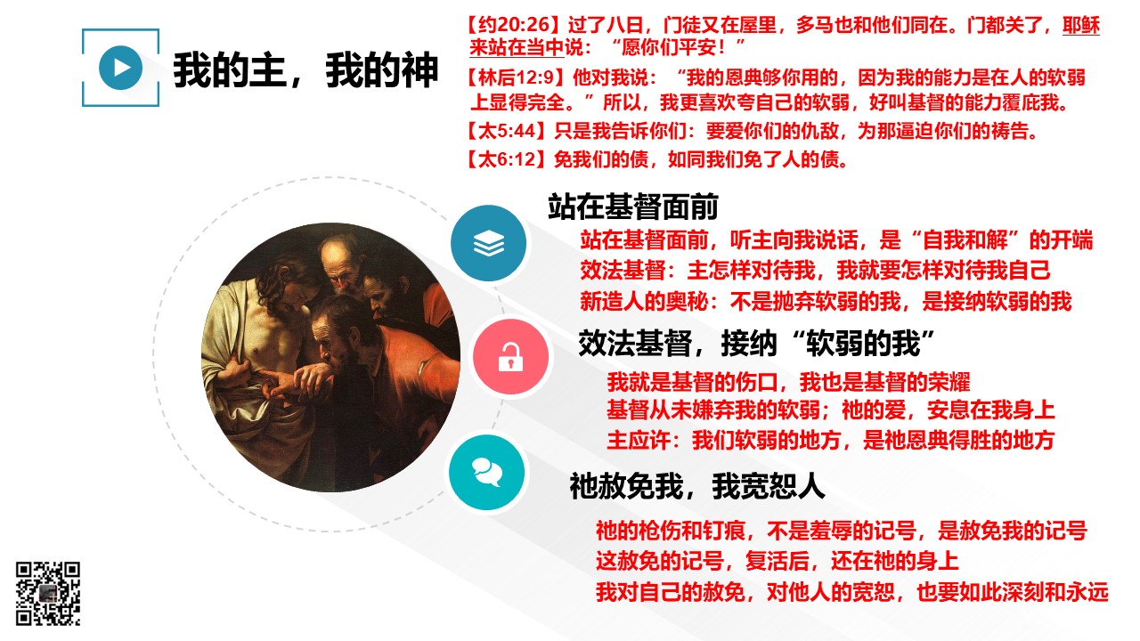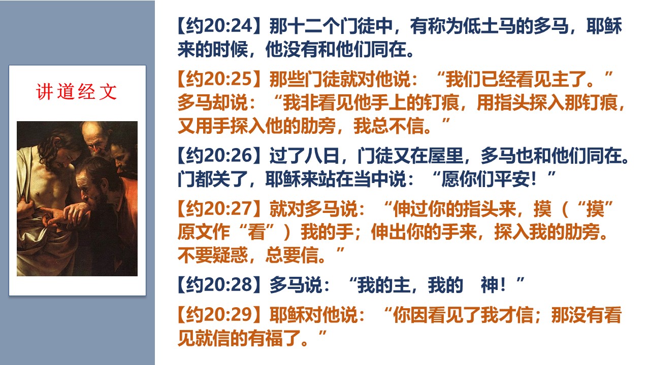 多马探手入主基督的肋旁,惊呼说“我的主,我的神”