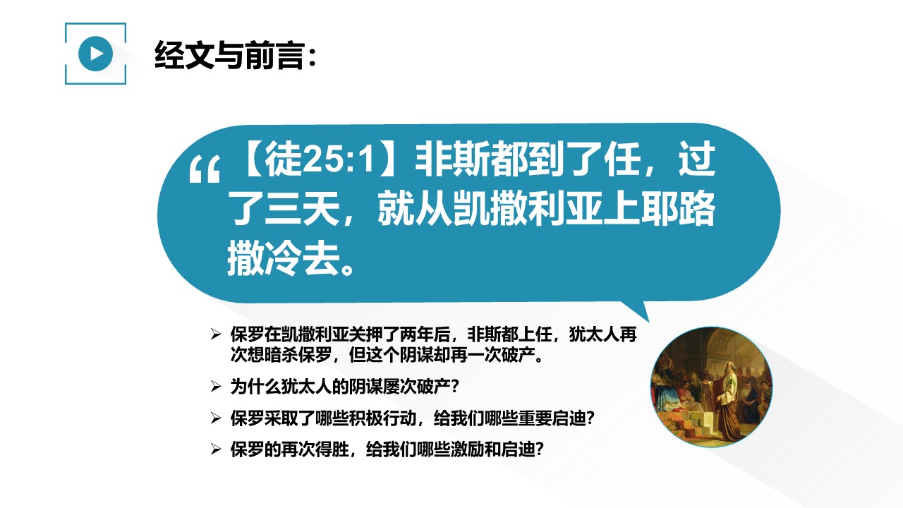 保罗在凯撒利亚关押了两年后,非斯都上任,犹太人再次想暗杀保罗,但这个阴谋却再一次破产。